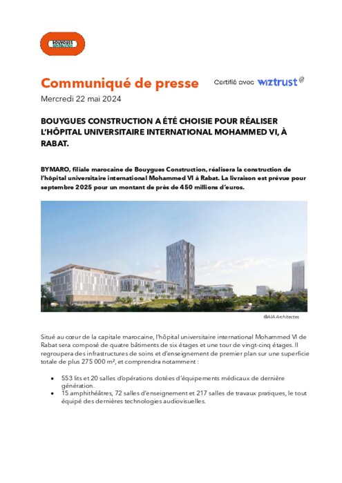 BYMARO, filiale marocaine de Bouygues Construction, réalisera la construction de l’hôpital universitaire international Mohammed VI à Rabat. La livraison est prévue pour septembre 2025 pour un montant de près de 450 millions d’euros.