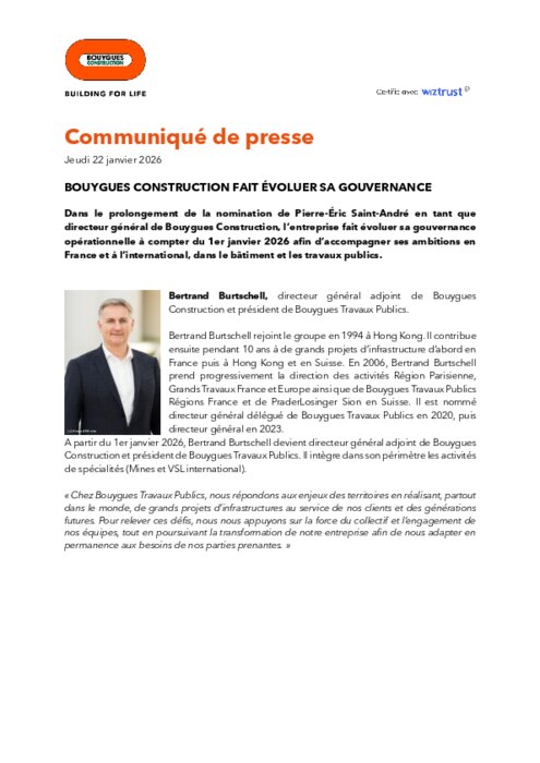 Dans le prolongement de la nomination de Pierre-Éric Saint-André en tant que directeur général de Bouygues Construction, l’entreprise fait évoluer sa gouvernance opérationnelle à compter du 1er janvier 2026 afin d’accompagner ses ambitions en France et à l’international, dans le bâtiment et les travaux publics.