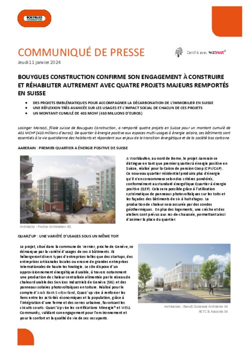 Losinger Marazzi, filiale suisse de Bouygues Construction, a remporté quatre projets en Suisse pour un montant cumulé de 401 MCHF (410 millions d’euros). De quartier à énergie positive aux espaces multi-usages à énergie solaire, ces bâtiments sont essentiels à la vie quotidienne des habitants et répondent aux enjeux de la transition énergétique et de la société bas carbone.