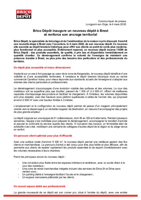 Brico Dépôt, le spécialiste du bricolage et de l’amélioration de la maison à prix discount, franchit une nouvelle étape à Brest avec l’ouverture, le 4 mars, de son nouveau dépôt. Ce nouveau site succède au dépôt brestois historique pour offrir aux clients un point de vente plus moderne, plus fonctionnel et plus accessible. Entièrement repensé, ce nouveau dépôt incarne l’ADN de Brico Dépôt : des produits essentiels, de qualité, à prix bas et disponibles immédiatement en quantité chantier. Ce déménagement confirme la volonté de l’enseigne de maintenir une présence durable à Brest, au plus près des besoins des particuliers et des professionnels du territoire.