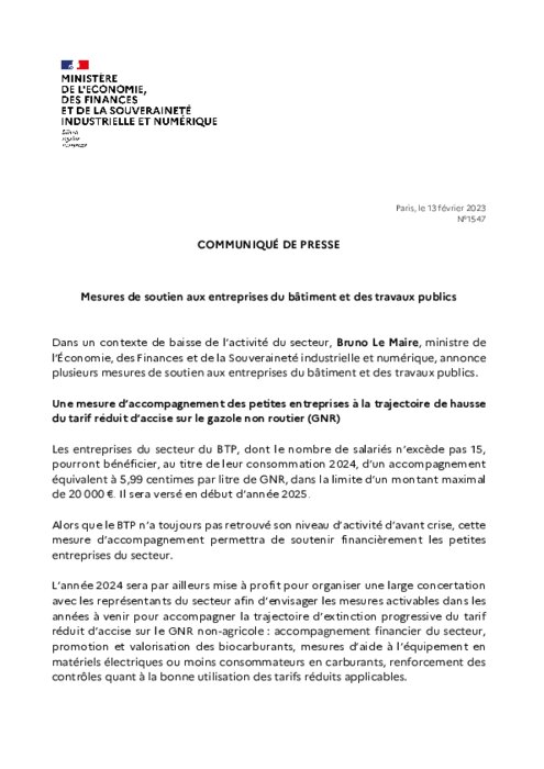 Institutionnels 13 février 2024 - 17:10 Dans un contexte de baisse de l’activité du secteur, Bruno Le Maire, ministre de l’Économie, des Finances et de la Souveraineté industrielle et numérique, annonce plusieurs mesures de soutien aux entreprises du bâtiment et des travaux publics. PDF (69 Ko) Télécharger Bruno Le Maire (Crédits : Sebastian van Ter Burg)