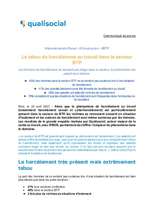 Alors que le phénomène de harcèlement au travail (notamment harcèlement sexuel et cyberharcèlement) est particulièrement présent dans le secteur du BTP, les victimes se retrouvent souvent en situation d’isolement et les auteurs de harcèlement sont même soutenus par les témoins. Les résultats de la grande enquête réalisée par Qualisocial, acteur majeur de la santé au travail, avec IPSOS, permettent de chiffrer l’ampleur du phénomène dans le domaine.