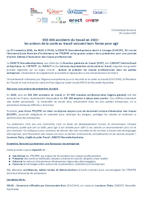 Face à ce constat, la DREETS Nouvelle-Aquitaine (Direction régionale de l’Économie, de l’Emploi, du Travail et des Solidarités) se mobilise aux côtés de ses partenaires, la Direction générale du travail (DGT), les CARSAT Centre-Ouest et Aquitaine, l’OPPBTP, l’ARACT et les Services de prévention et de santé au travail, pour renforcer la culture de la prévention dans les TPE et PME du territoire.