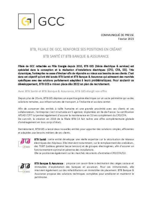 Filiale de GCC rattachée au Pôle Energie depuis 2010, BTB GES (Génie électrique & services) est spécialisé dans la conception et la réalisation d’installations électriques (CFO, CFA, SSI). Très dynamique, l’entreprise ne cesse d’évoluer afin de répondre au mieux aux besoins de ses clients. C’est dans cet objectif qu’ont été lancés BTB Santé et BTB Banque & Assurance qui adressent des marchés spécifiques avec des solutions parfaitement adaptées à leurs problématiques.
