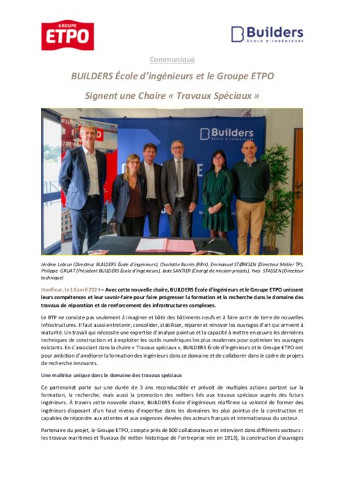 Avec cette nouvelle chaire, BUILDERS École d’ingénieurs et le Groupe ETPO unissent leurs compétences et leur savoir-faire pour faire progresser la formation et la recherche dans le domaine des travaux de réparation et de renforcement des infrastructures complexes.