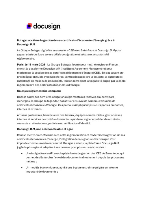 Le Groupe Butagaz, fournisseur multi-énergies en France, choisit la plateforme Docusign IAM (Intelligent Agreement Management) pour moderniser la gestion de ses certificats d’économie d’énergie (CEE). En s’appuyant sur une intégration fluide avec Salesforce, l’entreprise accélère la collecte, la signature et l’archivage de milliers de documents, tout en renforçant la traçabilité exigée par le cadre réglementaire des certificats d’économie d’énergie.
