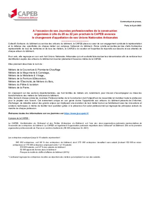 La CAPEB annonce le changement d'appellation de ses Unions Nationales Artisanales