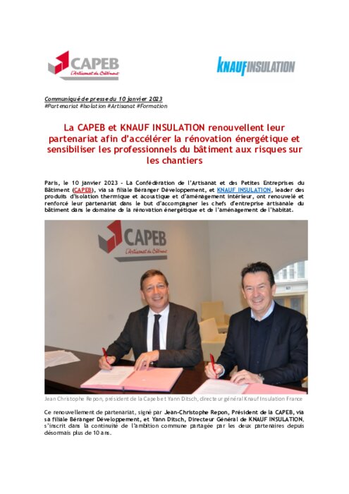 La Confédération de l’Artisanat et des Petites Entreprises du Bâtiment (CAPEB), via sa filiale Béranger Développement, et KNAUF INSULATION, leader des produits d’isolation thermique et acoustique et d’aménagement intérieur, ont renouvelé et renforcé leur partenariat dans le but d’accompagner les chefs d’entreprise artisanale du bâtiment dans le domaine de la rénovation énergétique et de l’aménagement de l’habitat.