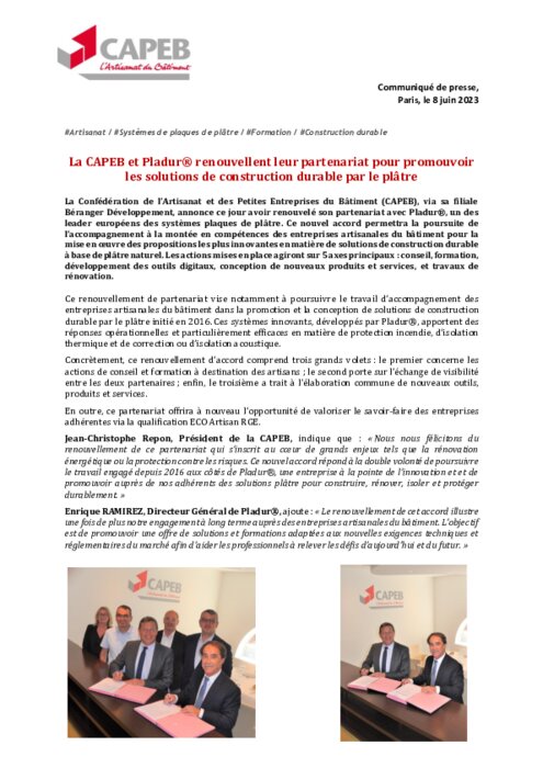 Ce nouvel accord permettra la poursuite de l’accompagnement à la montée en compétences des entreprises artisanales du bâtiment pour la mise en œuvre des propositions les plus innovantes en matière de solutions de construction durable à base de plâtre naturel. Les actions mises en place agiront sur 5 axes principaux : conseil, formation, développement des outils digitaux, conception de nouveaux produits et services, et travaux de rénovation.