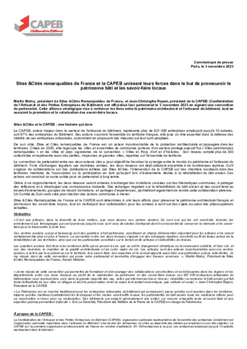 Martin Malvy, président de Sites & Cités Remarquables de France, et Jean-Christophe Repon, président de la Capeb (Confédération de l'Artisanat et des Petites Entreprises du Bâtiment) ont officialisé leur partenariat le 3 novembre 2023 en signant une convention de partenariat. Cette alliance stratégique vise à renforcer les liens entre le patrimoine architectural et l'artisanat du bâtiment, tout en assurant la promotion et la valorisation des savoir-faire locaux.