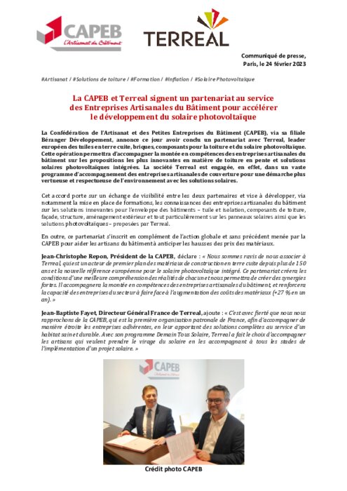 La Confédération de l’Artisanat et des Petites Entreprises du Bâtiment (CAPEB), via sa filiale Béranger Développement, annonce ce jour avoir conclu un partenariat avec Terreal, leader européen des tuiles en terre cuite, briques, composants pour la toiture et du solaire photovoltaïque.