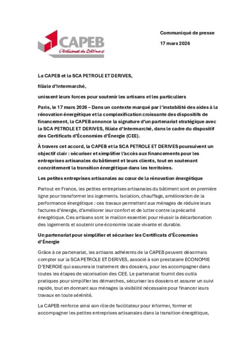 Dans un contexte marqué par l’instabilité des aides à la rénovation énergétique et la complexification croissante des dispositifs de financement, la CAPEB annonce la signature d’un partenariat stratégique avec la SCA PETROLE ET DERIVES, filiale d’Intermarché, dans le cadre du dispositif des Certificats d’Économies d’Énergie (CEE).