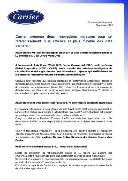 À l’occasion du Data Center World 2025, Carrier France a dévoilé deux avancées technologiques majeures conçues pour accompagner la montée en puissance des infrastructures numériques et répondre aux enjeux d’efficacité énergétique du secteur. Ces solutions s’inscrivent dans la stratégie de décarbonation et d’innovation durable portée par les équipes en France, notamment sur les sites industriels de Montluel et de Culoz.