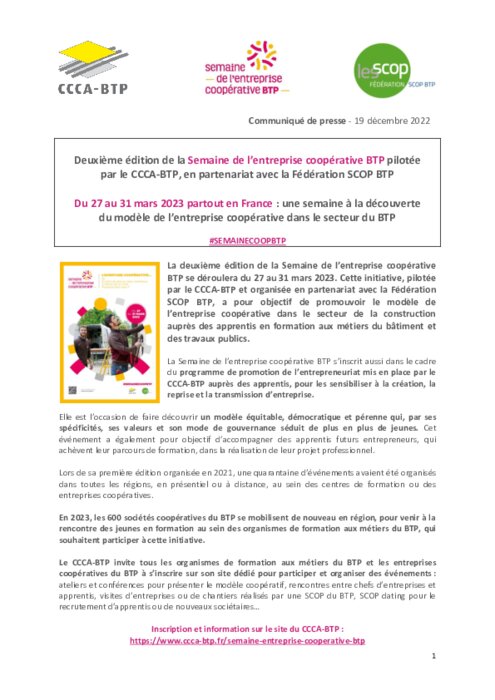 Le CCCA-BTP annonce la deuxième édition de la Semaine de l’entreprise coopérative BTP