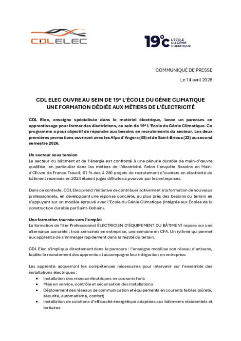 CDL Elec, enseigne spécialisée dans le matériel électrique, lance un parcours en apprentissage pour former des électriciens, au sein de 19° L’Ecole du Génie Climatique. Ce programme a pour objectif de répondre aux besoins en recrutements du secteur. Les deux premières promotions ouvriront avec les Afpa d’Angers (49) et de Saint-Brieuc (22) au second semestre 2026.