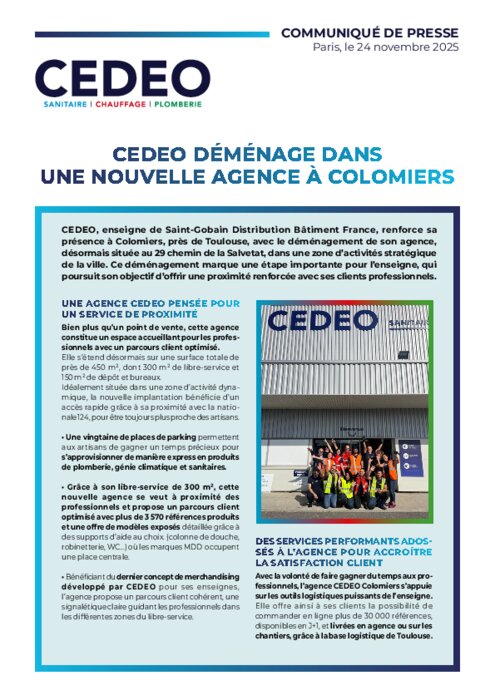 CEDEO, enseigne de Saint-Gobain Distribution Bâtiment France, renforce sa présence à Colomiers, près de Toulouse, avec le déménagement de son agence, désormais située au 29 chemin de la Salvetat, dans une zone d’activités stratégique de la ville. Ce déménagement marque une étape importante pour l’enseigne, qui poursuit son objectif d’offrir une proximité renforcée avec ses clients professionnels.