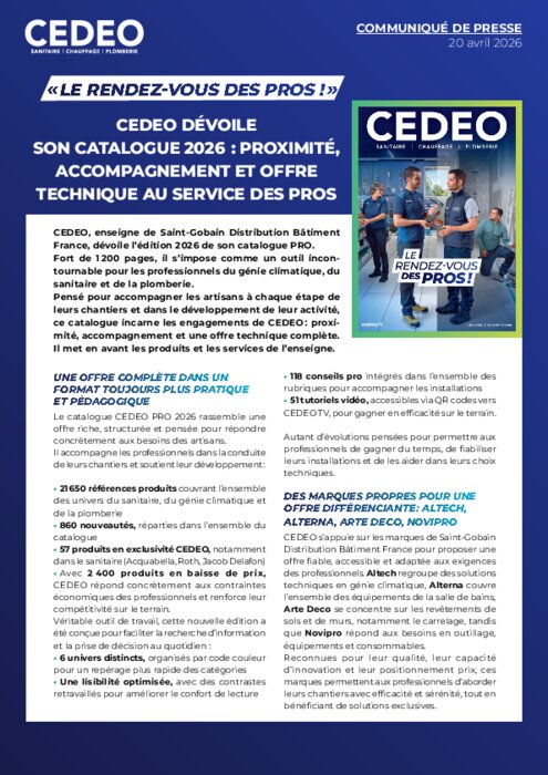 CEDEO, enseigne de Saint-Gobain Distribution Bâtiment France, dévoile l’édition 2026 de son catalogue PRO. Fort de 1 200 pages, il s’impose comme un outil incontournable pour les professionnels du génie climatique, du sanitaire et de la plomberie. Pensé pour accompagner les artisans à chaque étape de leurs chantiers et dans le développement de leur activité, ce catalogue incarne les engagements de CEDEO : proximité, accompagnement et une offre technique complète. Il met en avant les produits et les services de l’enseigne.