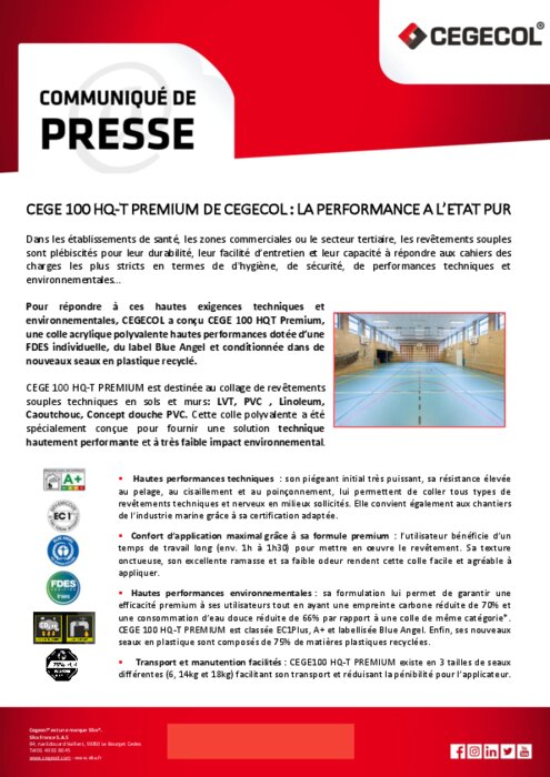 Industriels 11 janvier 2024 - 14:26 CEGECOL a conçu CEGE 100 HQT Premium, une colle acrylique polyvalente hautes performances dotée d’une FDES individuelle, du label Blue Angel et conditionnée dans de nouveaux seaux en plastique recyclé. PDF (386 Ko) Télécharger
