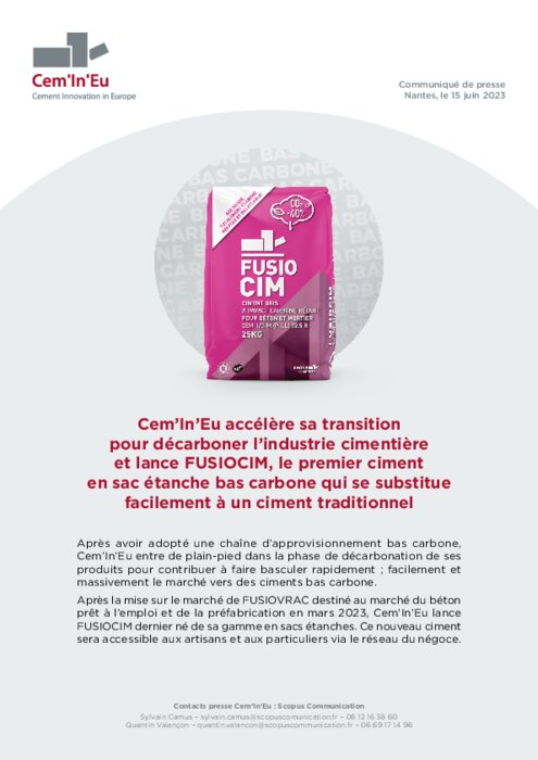 Après la mise sur le marché de Fusiovrac destiné au marché du béton prêt à l'emploi et de la préfabrication en mars 2023, Cem'In'Eu lance Fusiocim dernier né de sa gamme en sacs étanches. Ce nouveau ciment sera accessible aux artisans et aux particuliers via le réseau du négoce.