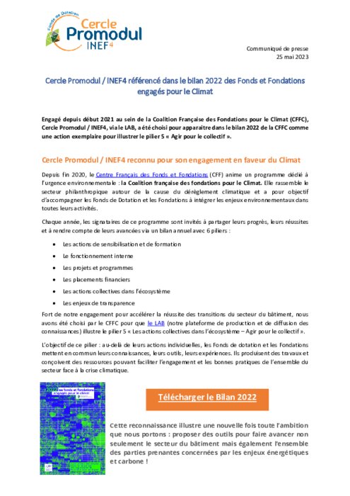 Engagé depuis début 2021 au sein de la Coalition Française des Fondations pour le Climat (CFFC), Cercle Promodul / INEF4, via le LAB, a été choisi pour apparaitre dans le bilan 2022 de la CFFC comme une action exemplaire pour illustrer le pilier 5 « Agir pour le collectif ».