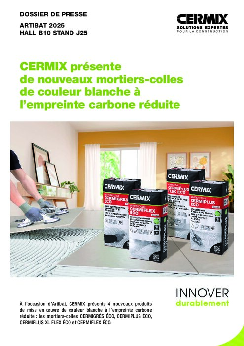Industriels 07 novembre 2025 - 11:11 Cermix présente 4 nouveaux produits de mise en œuvre de couleur blanche à l’empreinte carbone réduite : les mortiers-colles Cermigrès Éco, Cermiplus Éco, Cermiplus XL Flex Éco et Cermiflex Éco. PDF (604 Ko) Télécharger credit Cermix