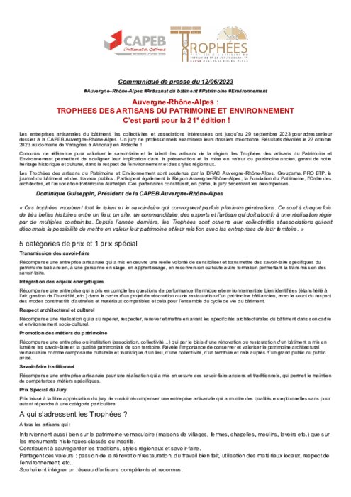 Les entreprises artisanales du bâtiment, les collectivités et associations intéressées ont jusqu’au 29 septembre 2023 pour adresser leur dossier à la CAPEB Auvergne-Rhône-Alpes. Un jury de professionnels examinera leurs dossiers mi-octobre. Résultats dévoilés le 27 octobre 2023 au domaine de Varagnes à Annonay en Ardèche.