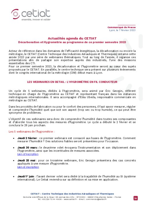 Acteur de référence dans les domaines de l’efficacité énergétique, la décarbonation ou encore la métrologie, le CETIAT (Centre Technique des Industries Aérauliques et Thermiques) entame cette année 2023 par une série de webinaires thématiques. Tout au long de l’année, il organise ces présentations afin de partager son expertise auprès des industriels, l’une des missions essentielles des CTI. Pour ce premier semestre 2023, la décarbonation et l’hygrométrie seront au cœur.