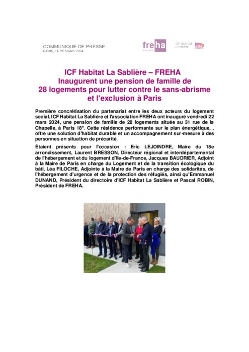 Première concrétisation du partenariat entre les deux acteurs du logement social, ICF Habitat La Sablière et l'association FREHA ont inauguré vendredi 22 mars 2024, une pension de famille de 28 logements située au 31 rue de la Chapelle, à Paris 18e. Cette résidence performante sur le plan énergétique, , offre une solution d'habitat durable et un accompagnement sur-mesure à des personnes en situation de précarité.