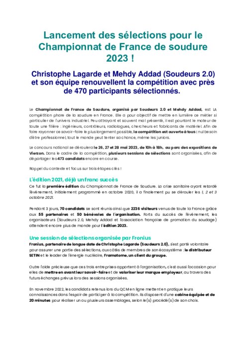 Le Championnat de France de Soudure, organisé par Soudeurs 2.0 et Mehdy Addad, est LA compétition phare de la soudure en France. Elle a pour objectif de mettre en lumière ce métier si particulier de l'univers industriel. Peu attrayant et souvent mal présenté, il est pourtant le moteur de toute une filière : ingénieurs, contrôleurs, radiologues, chercheurs et fabricants de matériel.