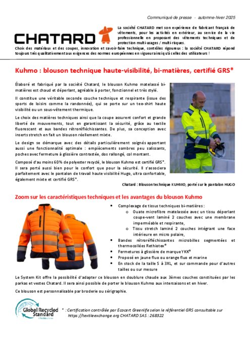 Chatard Kuhmo : un blouson technique haute-visibilité, bi-matières, certifié GRS