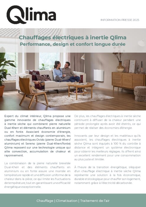 Expert du climat intérieur, Qlima propose une gamme innovante de chauffages électriques à inertie sèche qui combinent pierre naturelle Dual-Kherr et éléments chauffants en aluminium ou en fonte. Associant économie d’énergie, confort maximum et design contemporain, les chauffages électriques Ovido (pierre Dual-Kherr/aluminium) et Sereno (pierre Dual-Kherr/fonte) Qlima reposent sur une technologie unique qui allie convection, accumulation de chaleur et rayonnement.