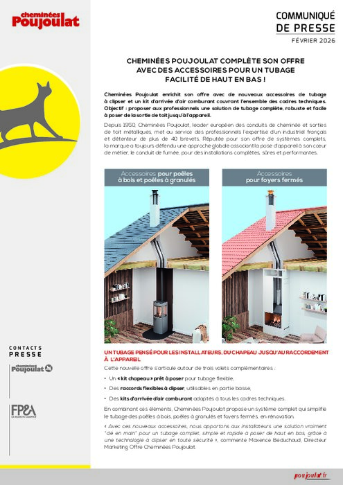 Depuis 1950, Cheminées Poujoulat, leader européen des conduits de cheminée et sorties de toit métalliques, met au service des professionnels l’expertise d’un industriel français et détenteur de plus de 40 brevets. Réputée pour son offre de systèmes complets, la marque a toujours défendu une approche globale associant la pose d’appareil à son cœur de métier, le conduit de fumée, pour des installations complètes, sûres et performantes.