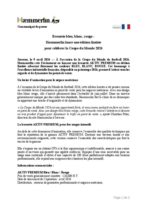 À l’occasion de la Coupe du Monde de football 2026, Haemmerlin crée l’événement en lançant une brouette AKTIV PREMIUM en édition limitée arborant fièrement les couleurs bleu, blanc, rouge. Cet hommage à l’excellence industrielle française, disponible au printemps 2026, promet d’attirer tous les regards et de dynamiser les points de vente.