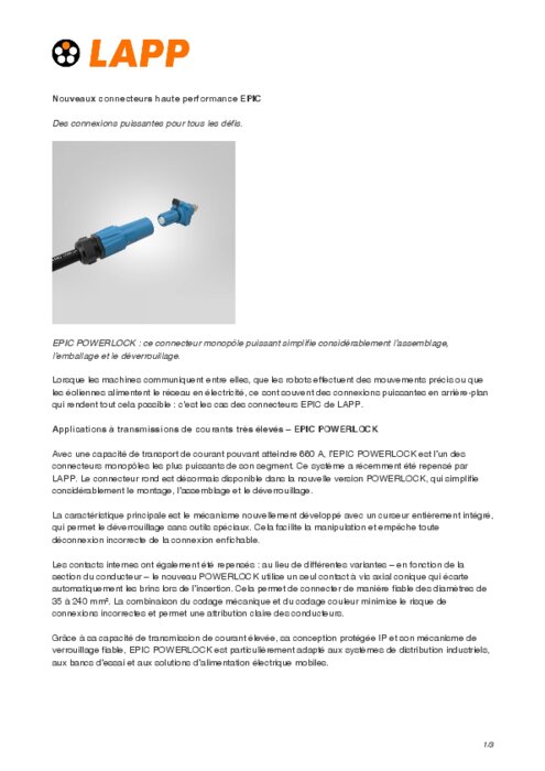 Lorsque les machines communiquent entre elles, que les robots effectuent des mouvements précis ou que les éoliennes alimentent le réseau en électricité, ce sont souvent des connexions puissantes en arrière-plan qui rendent tout cela possible : c'est les cas des connecteurs EPIC de LAPP.