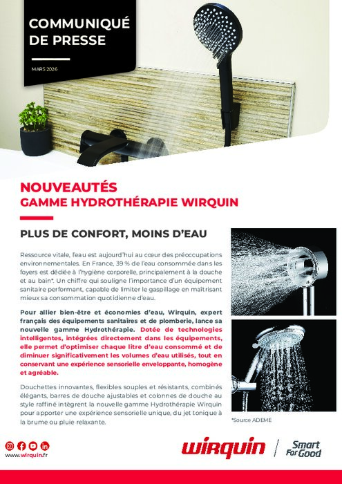 Pour allier bien-être et économies d’eau, Wirquin, expert français des équipements sanitaires et de plomberie, lance sa nouvelle gamme Hydrothérapie. Dotée de technologies intelligentes, intégrées directement dans les équipements, elle permet d’optimiser chaque litre d’eau consommé et de diminuer significativement les volumes d’eau utilisés, tout en conservant une expérience sensorielle enveloppante, homogène et agréable.