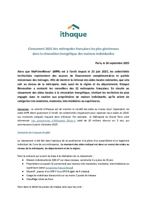 Alors que MaPrimeRénov’ (MPR) est à l’arrêt depuis le 23 juin 2025, les collectivités territoriales représentent des sources de financement complémentaires et parfois méconnues des ménages. Afin de montrer la richesse des aides locales existantes, que cela soit au niveau de la métropole, mais aussi de la région et du département, Ithaque Rénovation a contacté les conseillers des 22 métropoles françaises. En résulte un classement des aides locales à la rénovation énergétique, révélant les territoires les plus engagés dans le soutien aux propriétaires de maison individuelle, qu’ils soient de catégories très modestes, modestes, intermédiaires ou supérieures.