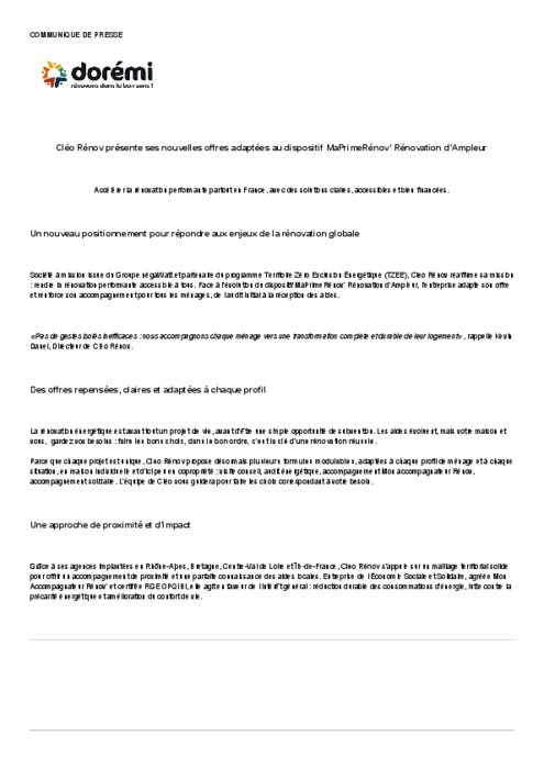 Société à mission issue du Groupe négaWatt et partenaire du programme Territoire Zéro Exclusion Énergétique (TZEE), Cleo Rénov réaffirme sa mission : rendre la rénovation performante accessible à tous. Face à l’évolution du dispositif MaPrimeRénov’ Rénovation d’Ampleur, l’entreprise adapte son offre et renforce son accompagnement pour tous les ménages, de l'audit initial à la réception des aides.