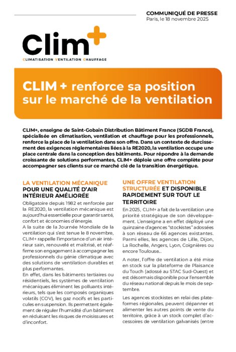 Clim+ (enseigne de Saint-Gobain Distribution Bâtiment France, spécialisée en climatisation, ventilation et chauffage pour les professionnels), renforce la place de la ventilation dans son offre. Dans un contexte de durcissement des exigences réglementaires liées à la RE2020, la ventilation occupe une place centrale dans la conception des bâtiments. Pour répondre à la demande croissante de solutions performantes, Clim+ déploie une offre complète pour accompagner ses clients sur ce marché clé de la transition énergétique.
