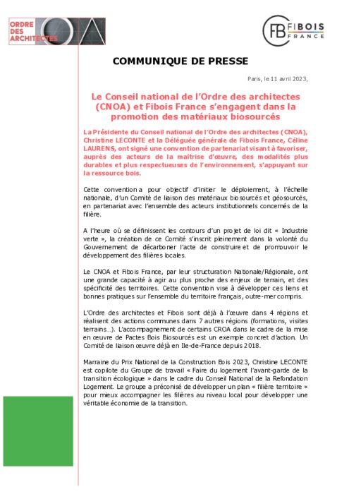 La Présidente du Conseil national de l’Ordre des architectes (CNOA), Christine LECONTE et la Déléguée générale de Fibois France, Céline LAURENS, ont signé une convention de partenariat visant à favoriser, auprès des acteurs de la maîtrise d’œuvre, des modalités plus durables et plus respectueuses de l’environnement, s’appuyant sur la ressource bois.