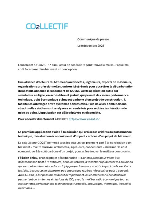 Une alliance d’acteurs du bâtiment (architectes, ingénieurs, experts en matériaux, organisations professionnelles, universités) réunis pour accélérer la décarbonation du secteur, annonce le lancement de CO2ST. Cette application est le 1er simulateur en ligne, en accès libre et gratuit, qui permet de croiser performance technique, coût économique et impact carbone d’un projet de construction. Il facilite les arbitrages entre systèmes constructifs. Plus de 4 600 combinaisons structurelles viables sont analysées en seule fois pour réduire les itérations de mise au point. L’application est déjà déployée et disponible.