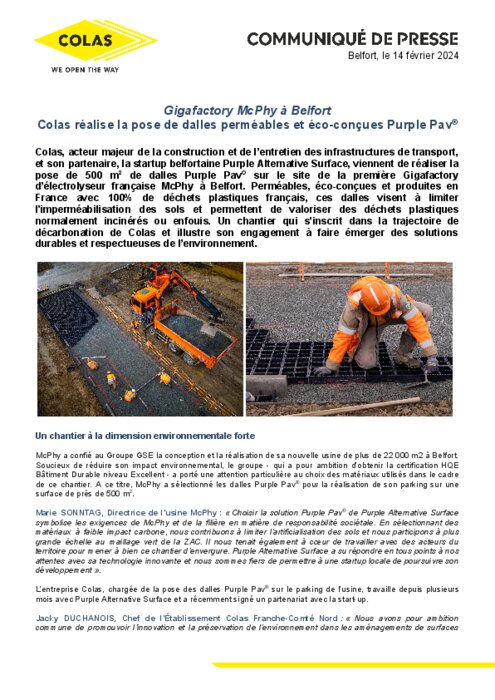 Colas, acteur majeur de la construction et de l’entretien des infrastructures de transport, et son partenaire, la startup belfortaine Purple Alternative Surface, viennent de réaliser la pose de 500 m2 de dalles Purple Pav sur le site de la première Gigafactory d’électrolyseur française McPhy à Belfort.