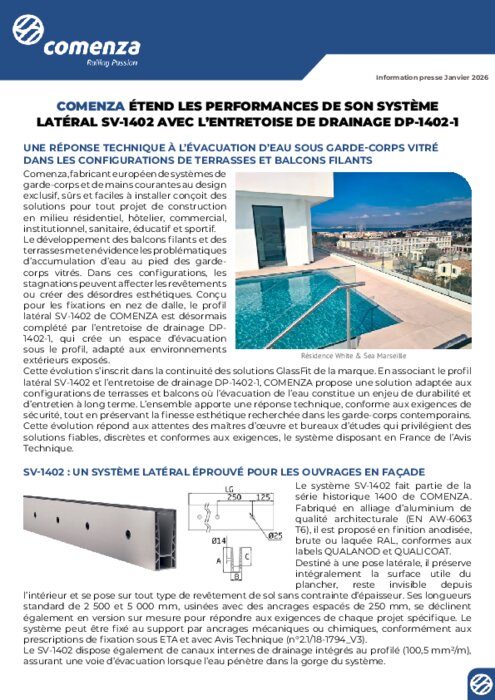 Le développement des balcons filants et des terrasses met en évidence les problématiques d’accumulation d’eau au pied des garde-corps vitrés. Dans ces configurations, les stagnations peuvent affecter les revêtements ou créer des désordres esthétiques. Conçu pour les fixations en nez de dalle, le profil latéral SV-1402 de COMENZA est désormais complété par l’entretoise de drainage DP-1402-1, qui crée un espace d’évacuation sous le profil, adapté aux environnements extérieurs exposés.
