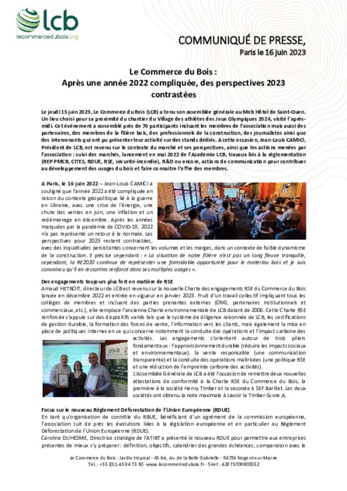 Le jeudi 15 juin 2023, Le Commerce du Bois (LCB) a tenu son assemblée générale au Mob Hôtel de Saint-Ouen. Un lieu choisi pour sa proximité du chantier du Village des athlètes des Jeux Olympiques 2024, visité l’après-midi. Cet événement a rassemblé près de 70 participants incluant les membres de l’association mais aussi des partenaires, des membres de la filière bois, des professionnels de la construction, des journalistes ainsi que des intervenants qui ont pu présenter leur activité.