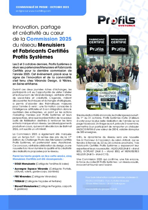Les 2 et 3 octobre derniers, Profils Systèmes a réuni ses partenaires Menuisiers et Fabricants Certifiés pour la dernière commission de l’année 2025. Cet événement, placé sous le signe de l’innovation et de la convivialité, s’est tenu chez Véranda Design, à Yèbles, en Seine-et-Marne.