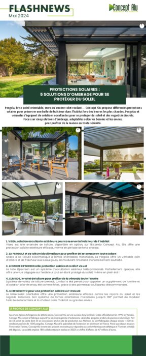 Industriels 15 mai 2024 - 10:23 Pergola, brise soleil orientable, store ou encore volet roulant… Concept Alu propose différentes protections solaires pour préserver une bulle de fraîcheur dans l’habitat lors des heures les plus chaudes. PDF (3 Mo) Télécharger