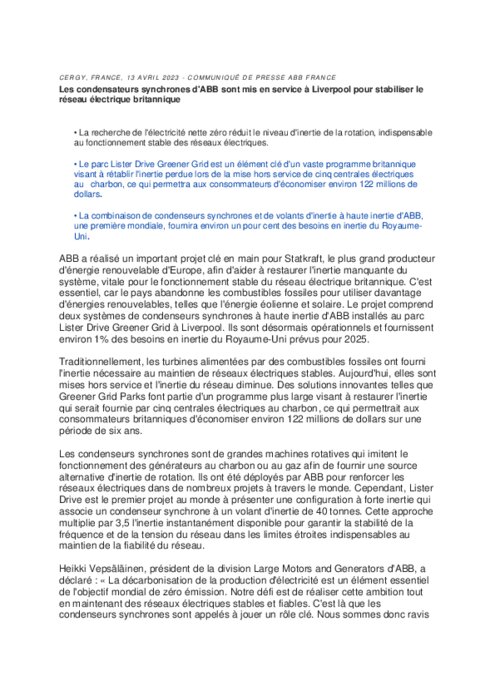 Le parc Lister Drive Greener Grid est un élément clé d'un vaste programme britannique visant à rétablir l'inertie perdue lors de la mise hors service de cinq centrales électriques au charbon, ce qui permettra aux consommateurs d'économiser environ 122 millions de dollars. La combinaison de condenseurs synchrones et de volants d'inertie à haute inertie d'ABB, une première mondiale, fournira environ un pour cent des besoins en inertie du Royaume-Uni.