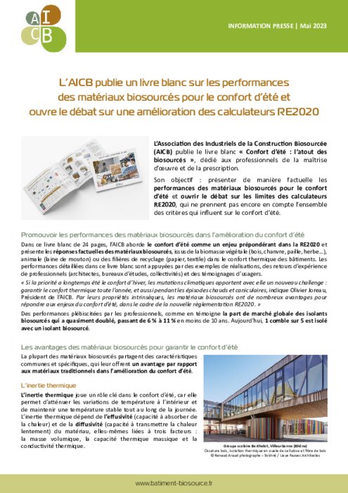 L'Association des Industriels de la Construction Biosourcée (AICB) publie le livre blanc « Confort d’été : l’atout des biosourcés », dédié aux professionnels de la maîtrise d’œuvre et de la prescription. Son objectif : présenter de manière factuelle les performances des matériaux biosourcés pour le confort d’été et ouvrir le débat sur les limites des calculateurs RE2020, qui ne prennent pas encore en compte l’ensemble des critères qui influent sur le confort d’été.