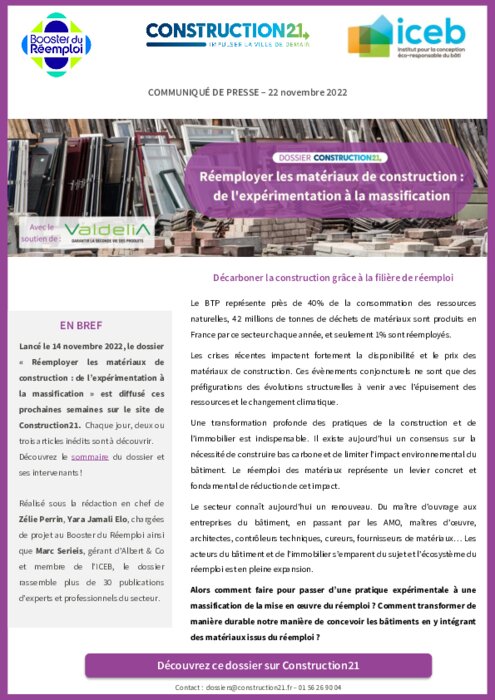 Lancé le 14 novembre 2022, le dossier « Réemployer les matériaux de construction : de l’expérimentation à la massification » est diffusé ces prochaines semaines sur le site de Construction21. Chaque jour, deux ou trois articles inédits sont à découvrir. Découvrez le sommaire du dossier et ses intervenants.