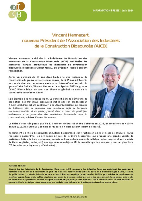Vincent Hannecart a été élu à la Présidence de l’Association des Industriels de la Construction Biosourcée (AICB), qui fédère les industriels français producteurs de matériaux de construction biosourcés. Son ambition : prolonger la démarche de promotion des matériaux biosourcés et contribuer à la décarbonisation du marché du bâtiment afin de répondre aux nombreux défis de l’urgence environnementale.