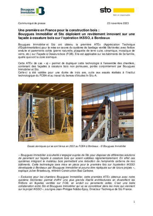 Bouygues Immobilier et Sto ont obtenu la première ATEx (Appréciation Technique d’Expérimentation) pour la mise en œuvre du système de bardage ventilé StoVentec avec finition enduite et parements collés (pierre naturelle, plaquette de terre cuite, céramique, mosaïque de verre, etc.) sur Façade à Ossature bois (FOB). Elle est applicable sur les bâtiments de 3e famille, quelle que soit la zone sismique.